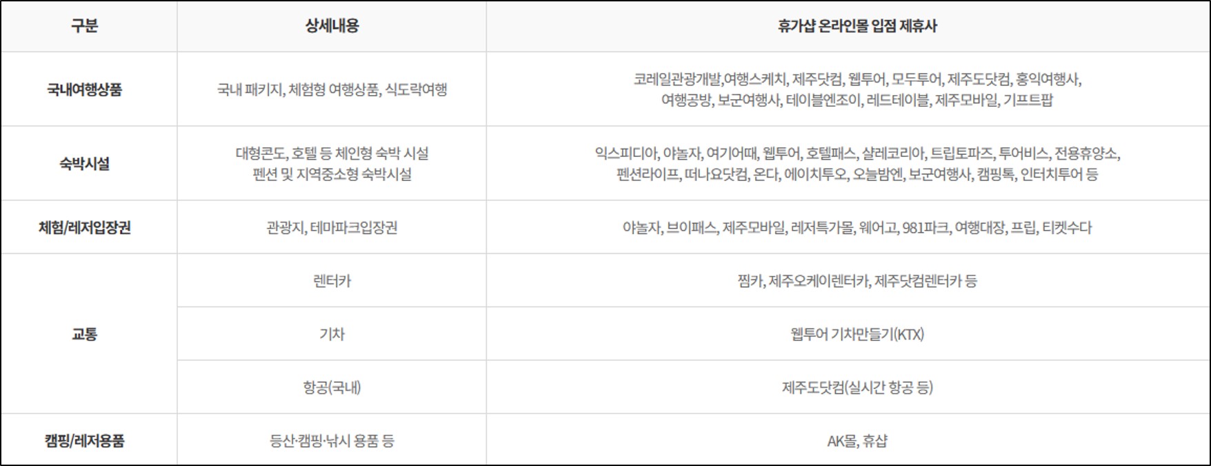 여행상품으로는 국내 패키지여행, 체험여행, 식도락 여행과 그 외의 어떤 여행이라도 가능합니다. 숙박시설은 대형 콘도를 비롯하여 호텔 등 체인형 숙박시설과 펜션 및 지역 중소도시의 숙박시설이 모두 사용 가능합니다. 관광지와 테마파크 시설의 체험과 레저 입장권 구매로도 사용할 수 있습니다. 그리고, 등산, 캠핑, 낚시 용품 등의 구매뿐만 아니라 렌터카, 기차, 항공권원 등 다양한 교통수단에 대한 비용도 지출이 가능합니다.
