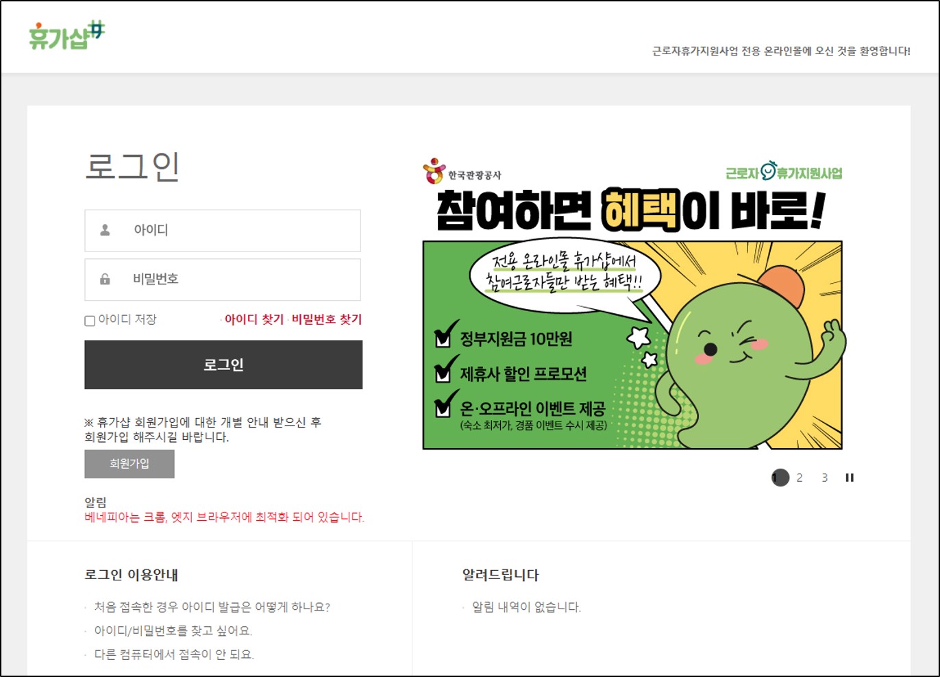 2024 근로자 휴가지원사업 전용 온라인몰인 휴가샵 SK베네피아는 해당 휴가지원사업에 참여하는 기업과 단체의 근로자만을 위한 폐쇄몰로 운영되고 있습니다.