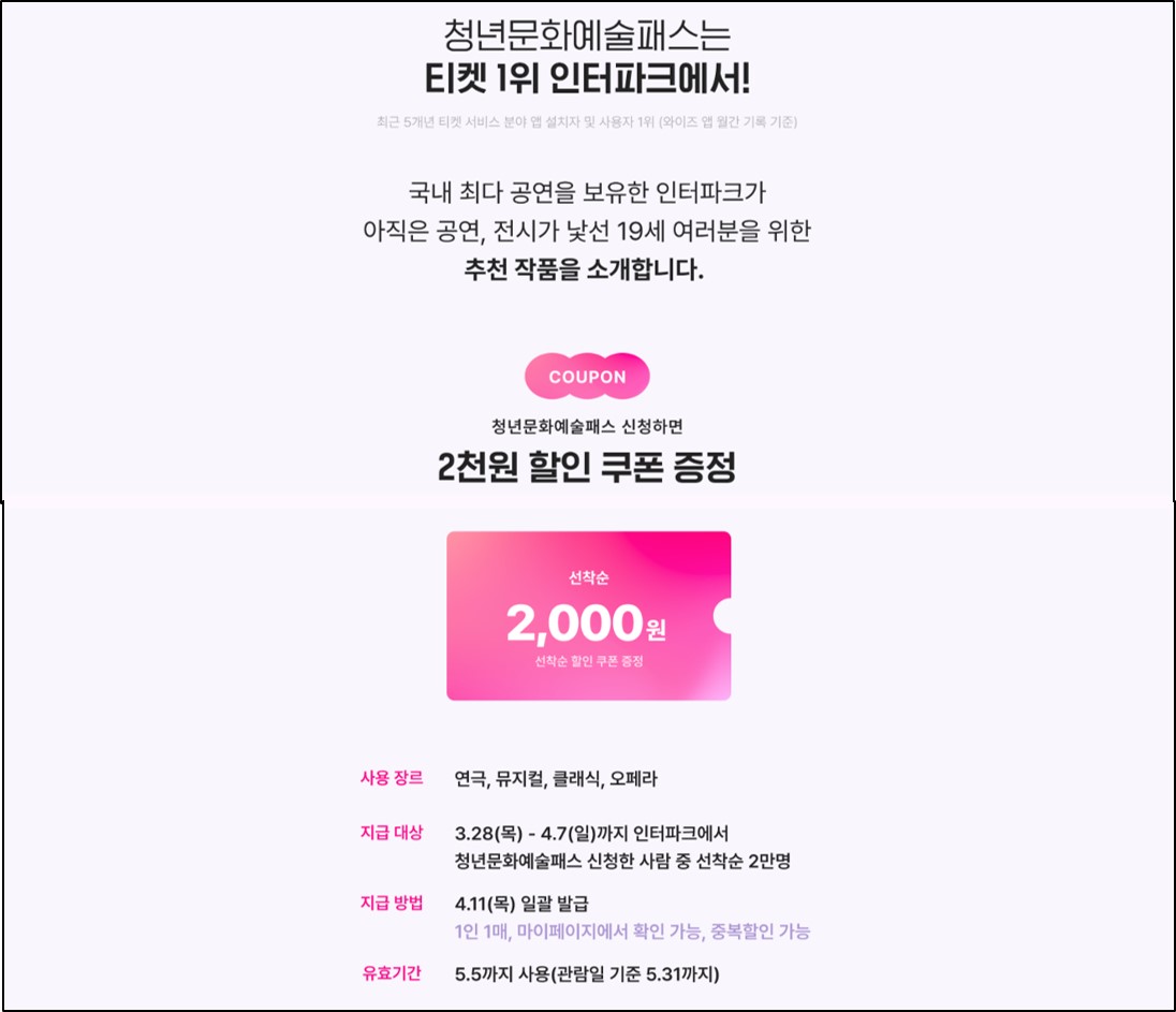 - 신청방법 : 청년문화예술패스 협력예매처 중 택 1(인터파크 or YES24).